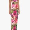 A striking strapless column gown featuring an abstract rose print that makes a bold statement. The structured bodice is designed with a cup detail and a draped overlay. creating a flattering silhouette.