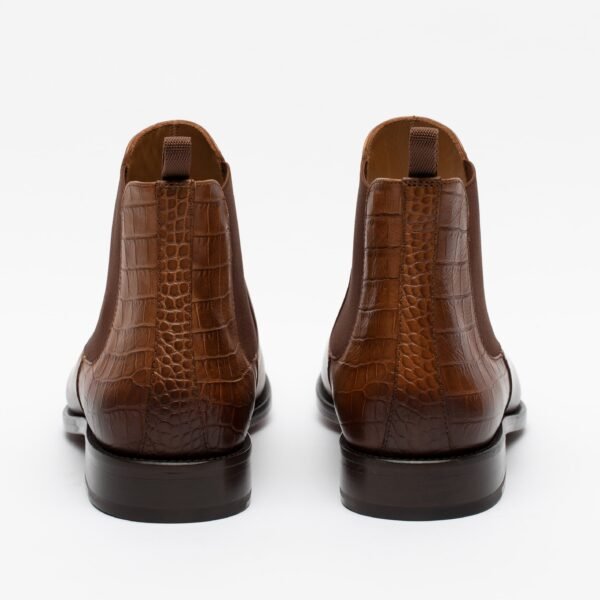 based on the classic Chelsea style. They are an easy pull-on and off shoe perfect for any event. The upper material has been constructed from boxcalf leather from Italy. while the counter is then constructed from a full grain leather that uniquely features an embossed croc detailing. With that interior completely lined with natural calfskin. the sole unit is stacked leather with a rubber insert. They easily become an instant favorite having them made with Blake Construction.