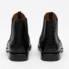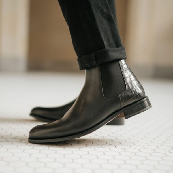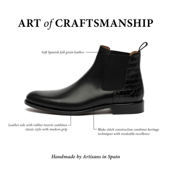 Our Hiro Boot in Midnight features a bold update from the classic Chelsea style giving you that perfect new jump into our boot collection. With their easy pull-on and pull-off feature. they are going to be a nice fit for all those special occasions. The upper material has been constructed from a boxcalf leather from Italy. and the cuff is constructed from a full grain leather with an embossed croc detailing. The interior is fully-lined with natural calfskin. and the sole unit is stacked leather with a rubber insert. They easily become an instant favorite having them made with Blake Construction.