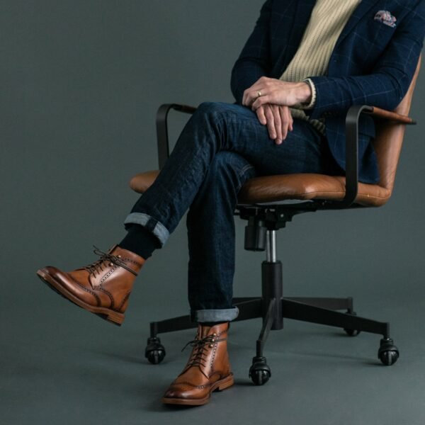 Our Mack Men’s Boots in Burnt Honey from TAFT are full brogue. seven-eyelet wingtip combat boots on a stacked leather heel. Featuring full-grain Vachetta natural leather and is hand-painted for a stunning finish.